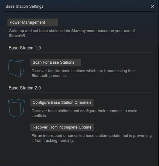 如果您在游戏区域内使用了两个以上的 SteamVR Base Station 2.0,可以更改额外基站的频道。
